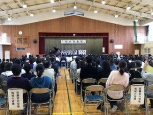 一年生から歌い始めました。1クラスの人数が少ない。まだ一年生。声が後ろまで届くかな?コーラスになるかな?と心配になります。歌い始めました。やはり一年生。男子の声がまだかわいい(*’▽’) でも、一生懸命歌っています。見学席では台小の6年生が聞いています。昨年まで一緒遊んで、登校したお兄さん、お姉さんがまるで大人のように見えるのでしょう。じっと見ていました。
